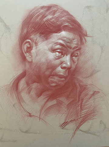 I am Ugly Series 1 of 4 by Jian Wu 24 " x 18 " Brown Pastel on Toned Paper